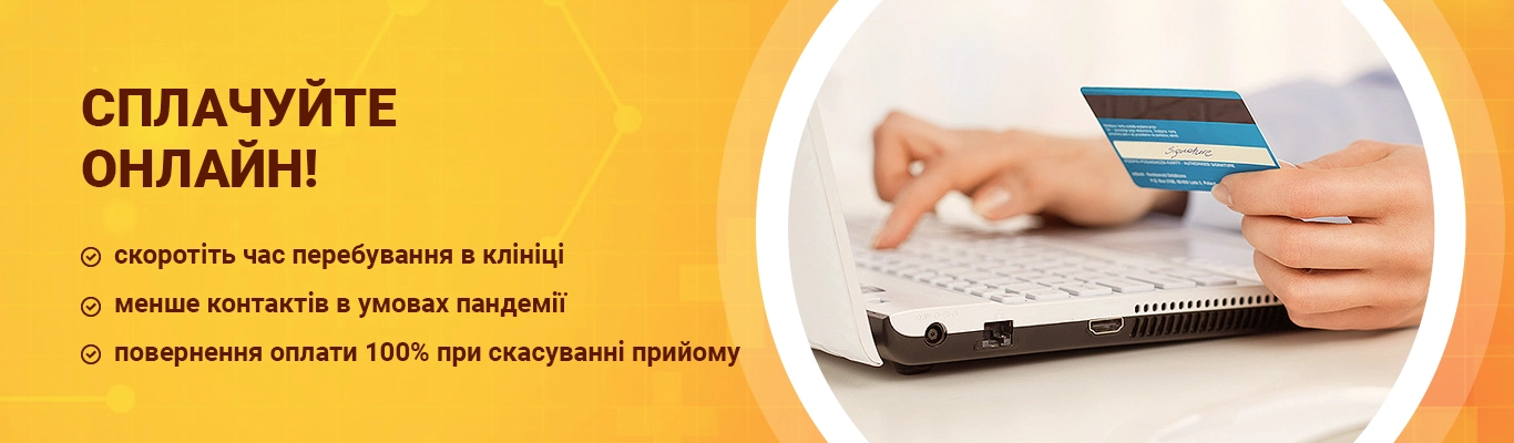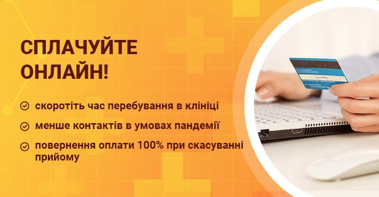 Для Вашого комфорту в клініці доступна онлайн оплата. З метою скорочення Вашого пребування у клініці і зменшення контактів із співробітниками клініки і готівкою, в умовах пандемії, пропонуємо Вам оплатит онлайн вдома. Це швидко і дуже просто.