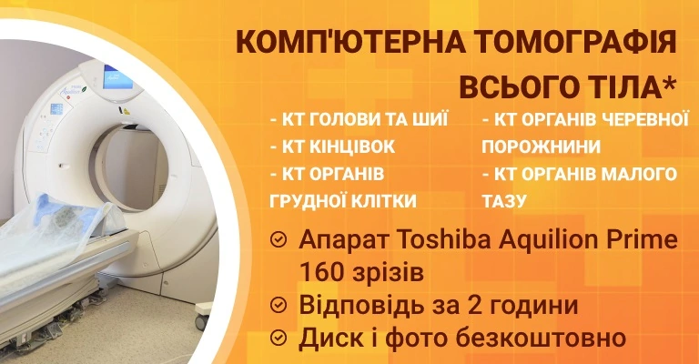 КТ всього тіла в клініці Добрий Прогноз включає: сканування голови, шиї, органів грудної клітки, органів черевної порожнини, органів тазу і КТ нижніх кінцівок з контрастним підсиленням.