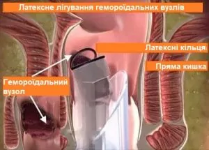 Лікування лігуванням латексними кільцями використовується для радикального видалення внутрішніх гемороїдальних вузлів другої-третьої стадії розвитку. Перетискання латексним кільцем ніжки вузла призводить до його відмирання та виходу з організму природним шляхом. Ця методика вважається малотравматичною та високорезультативною.