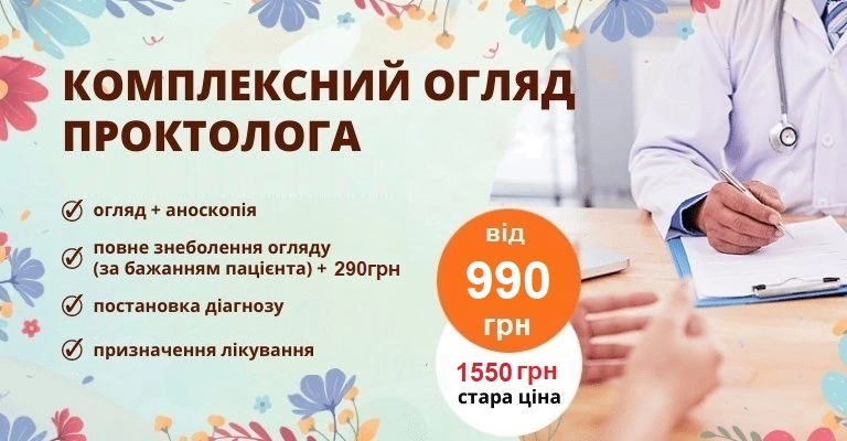 | Консультація проктолога + аноскопія Акція Огляд + аноскопія + постановка діагнозу Призначення лікування |